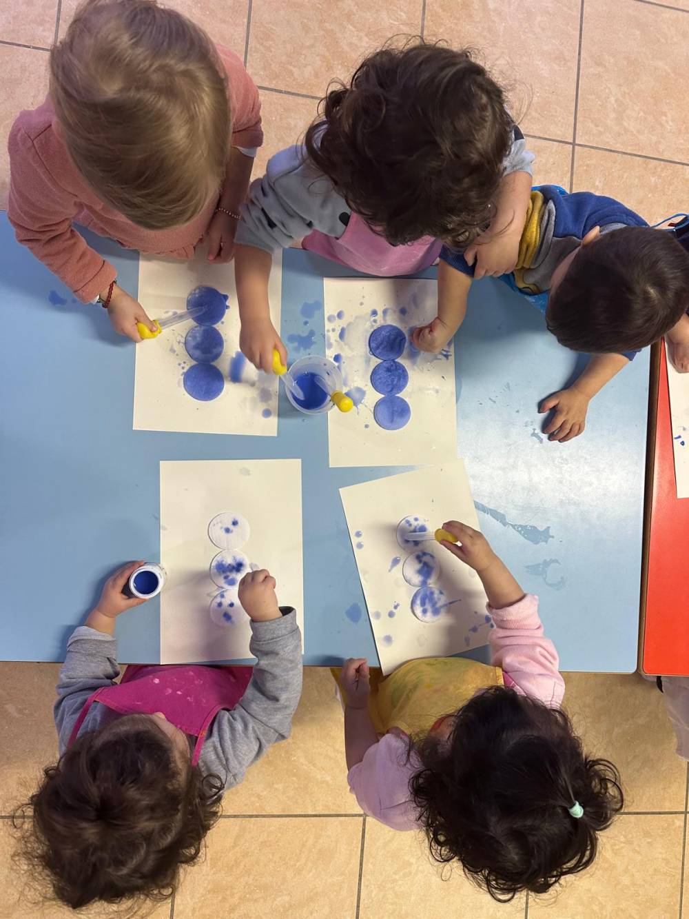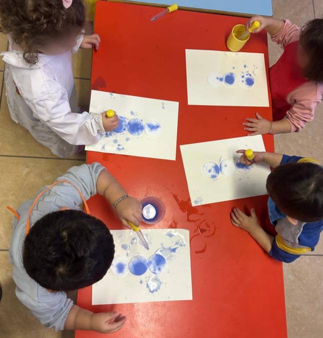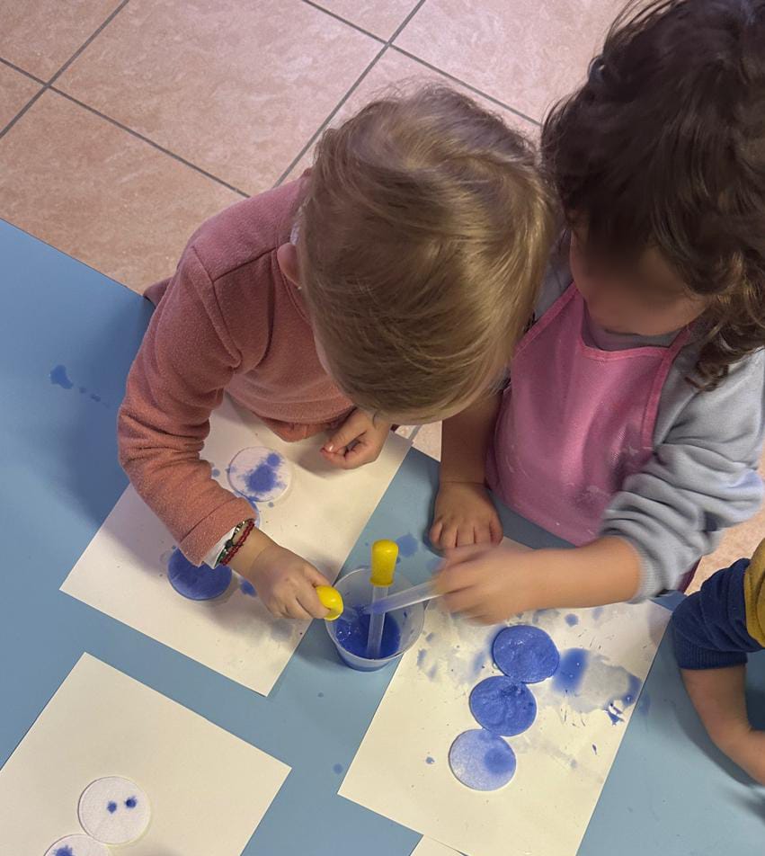 Attraverso la realizzazione del pupazzo di neve, i bambini hanno sperimentato l’uso di un nuovo strumento: la pipetta. L’attività ha favorito la coordinazione oculo-manuale, la concentrazione e il controllo del movimento, stimolando al tempo stesso la curiosità e il piacere della scoperta. Il colore che si trasferisce, le gocce che cadono e si trasformano in forma hanno reso l’esperienza coinvolgente e gratificante, lasciando spazio all’osservazione e alla sperimentazione libera.