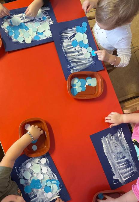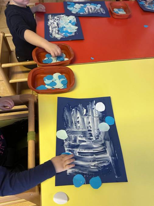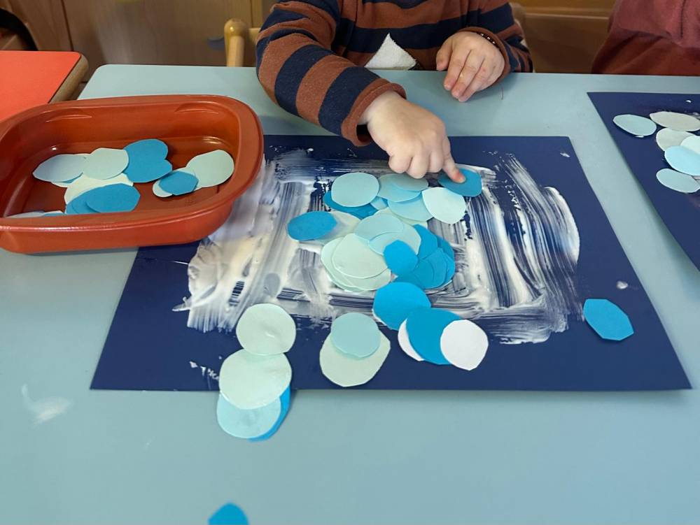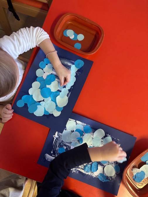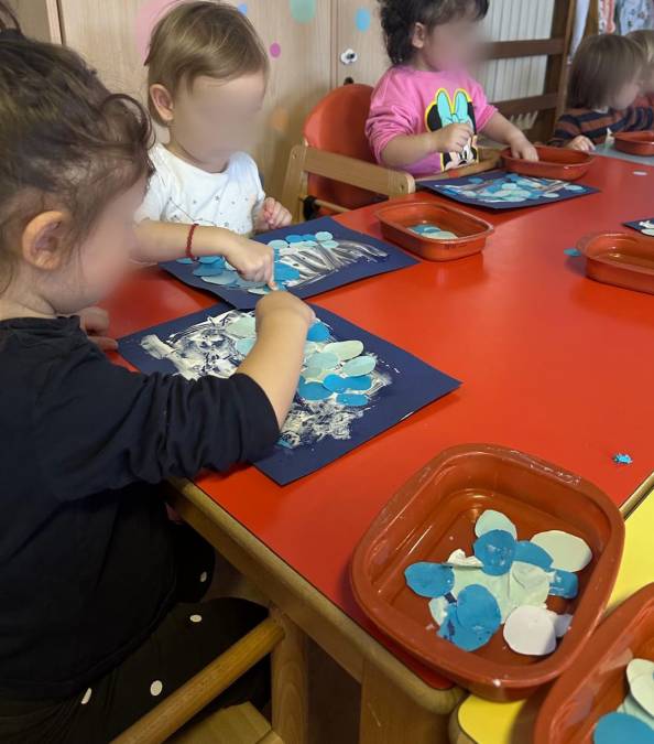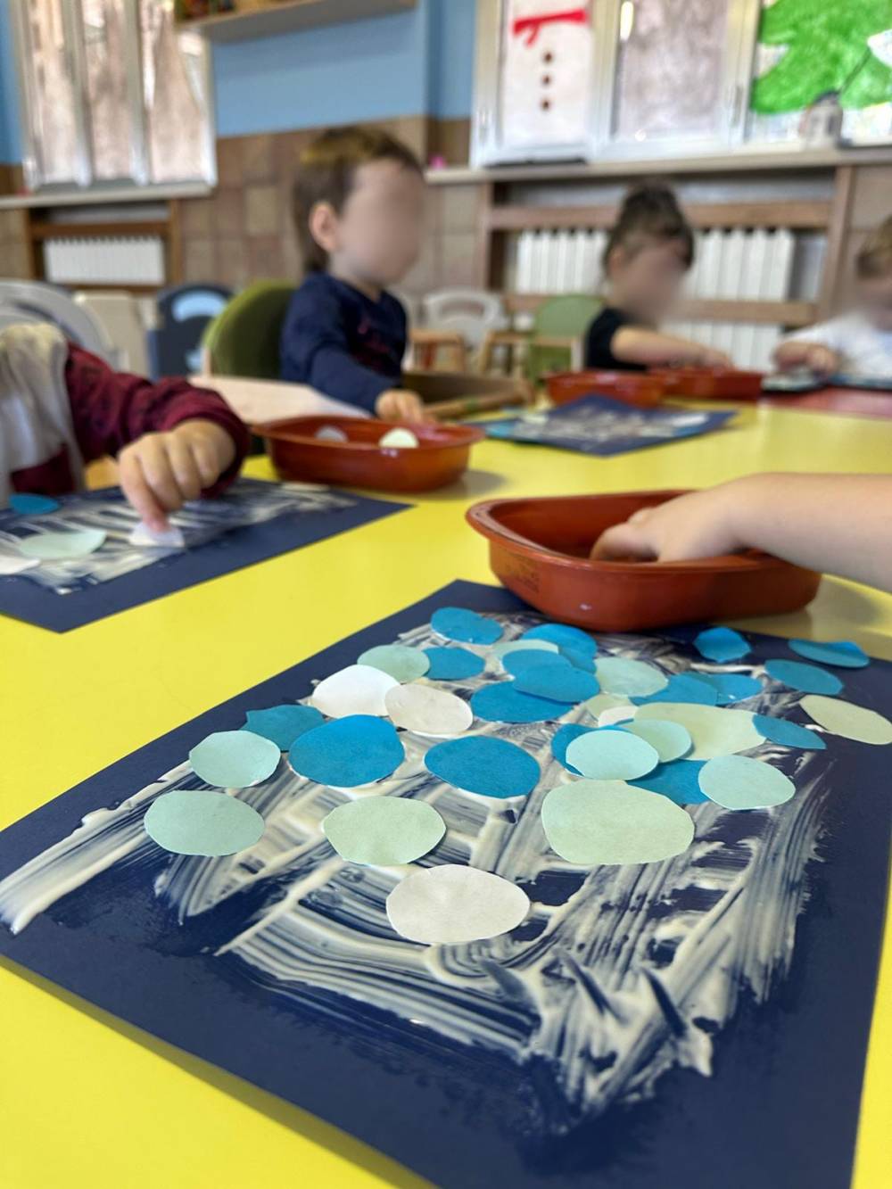 Attraverso il collage i bambini hanno esplorato i colori freddi, avvicinandosi alle atmosfere dell’inverno in modo sensoriale e concreto. L’attività ha sostenuto lo sviluppo della coordinazione oculo-manuale e della motricità fine, favorendo attenzione, concentrazione e piacere nel fare. La libertà di composizione ha permesso a ciascun bambino di esprimersi secondo i propri tempi, valorizzando creatività, scoperta e sperimentazione.