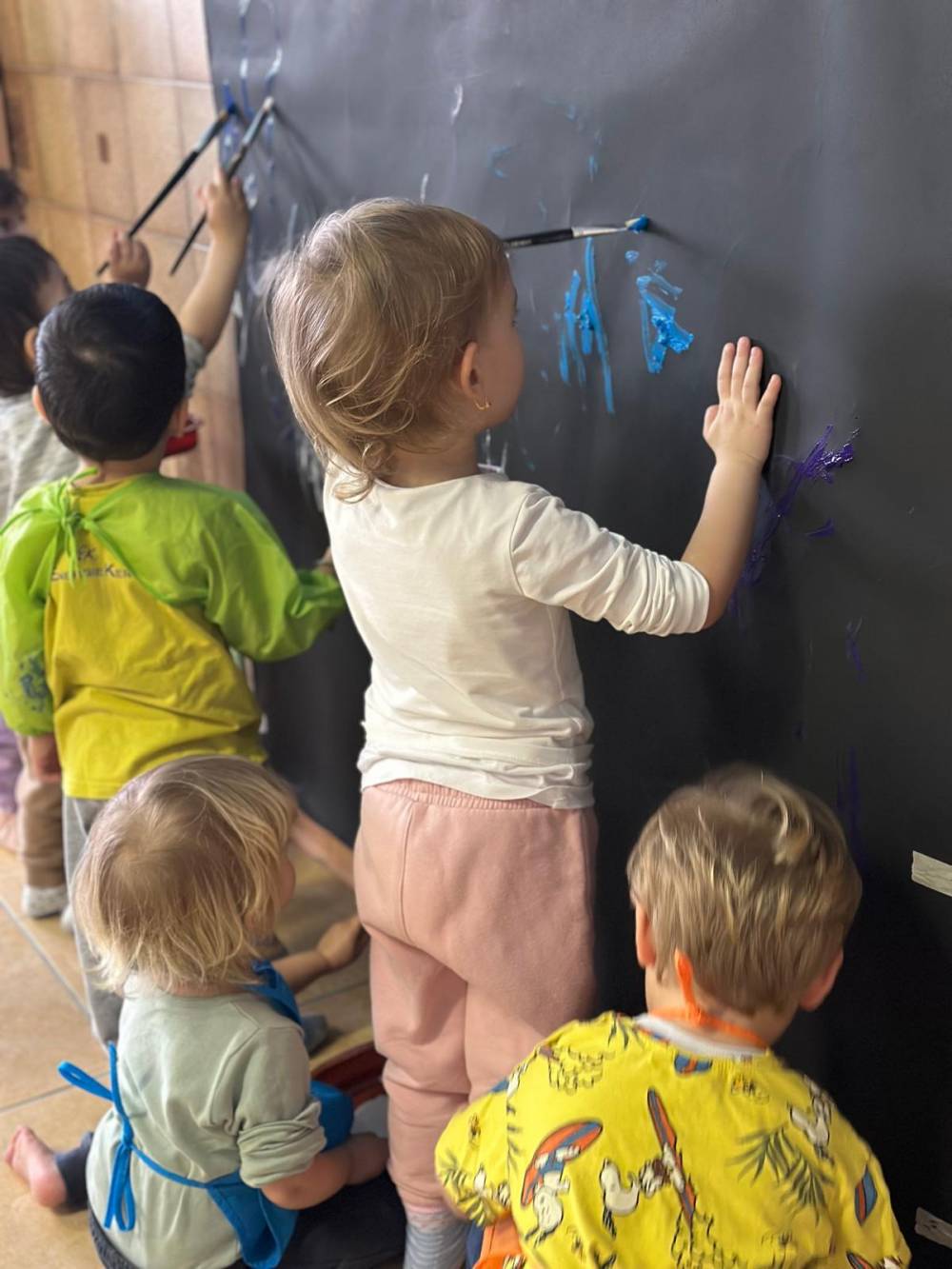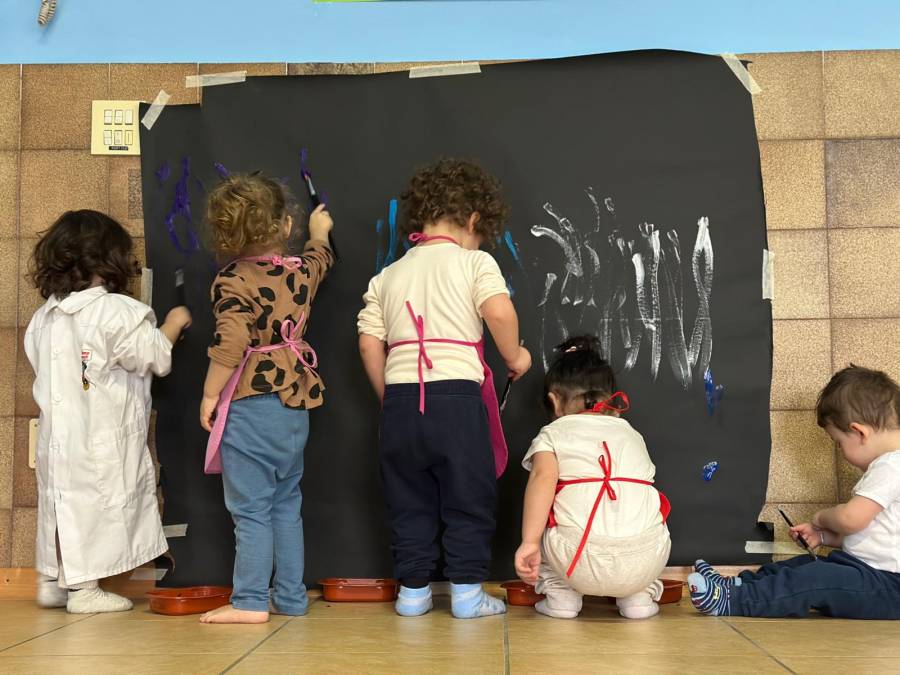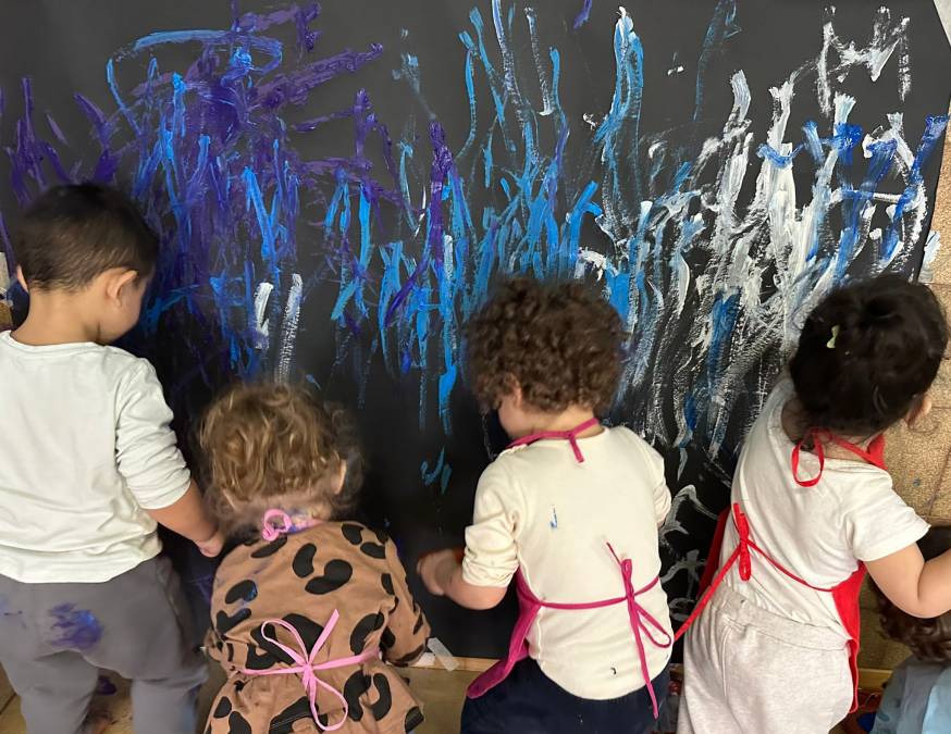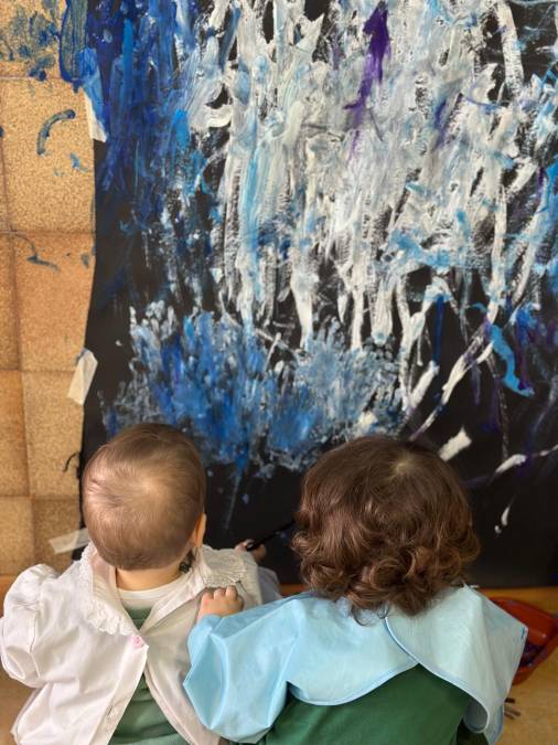 I bambini hanno sperimentato la pittura in verticale su un grande sfondo scuro che ha messo in risalto i colori e le tracce lasciate dal pennello. La scelta della posizione in piedi ha favorito un coinvolgimento corporeo più ampio mentre il forte contrasto tra fondo nero e tonalità di blu, viola, bianco e azzurro ha stimolato la percezione visiva e l’osservazione del segno.